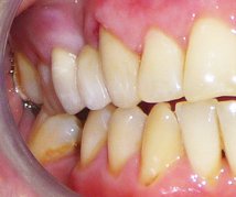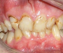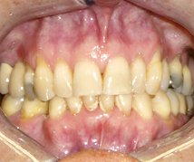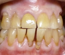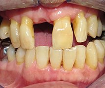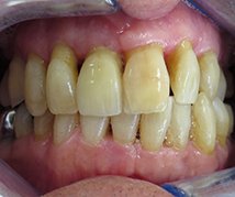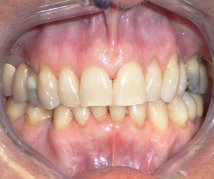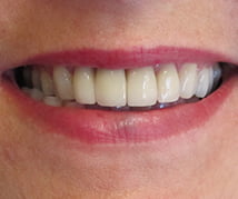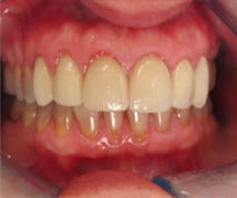 Modern all-ceramic crowns replacing unnatural looking old fashioned crowns with dark metal margins visible.