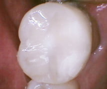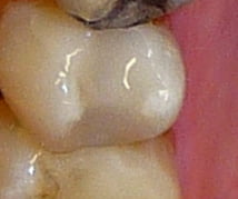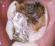 Large silver filling in premolar tooth. Silver filling replaced with a bonded tooth coloured filling.